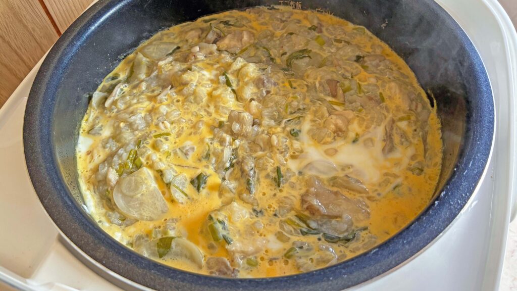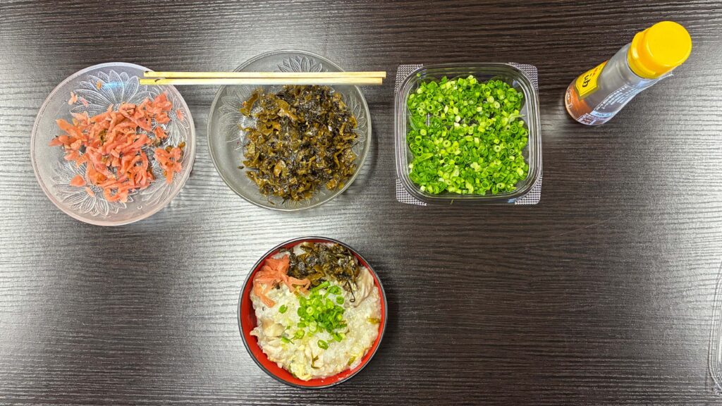 いつものように、春の七草(せり/なずな/ごぎょう/はこべら/ほとけのざ/すずな/すずしろ)を雑穀米に混ぜ、鶏ガラベースの中華風の味付けにしました。